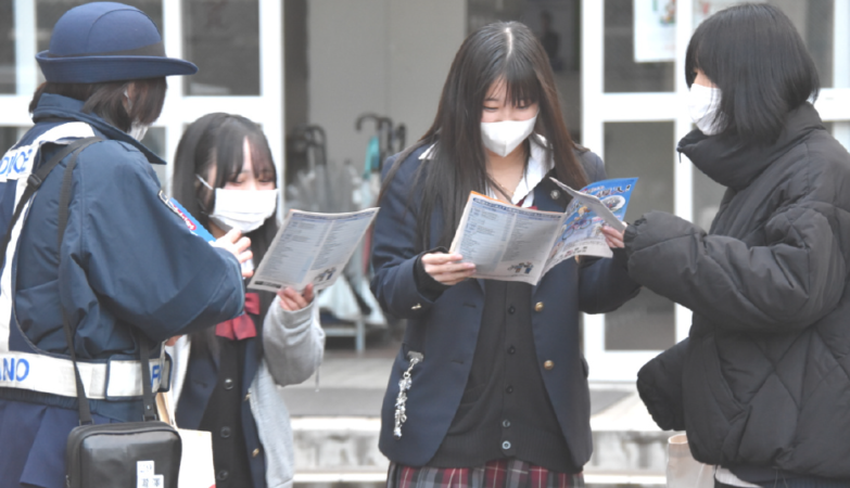屋代南高前で自転車用ヘルメット利用も呼びかけ 年末の交通安全運動に伴い街頭啓発