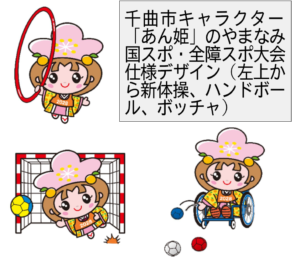 千曲市キャラクター「あん姫」のやまなみ国スポ・全障スポ大会仕様デザイン(左上から新体操、ハンドボール、ボッチャ)