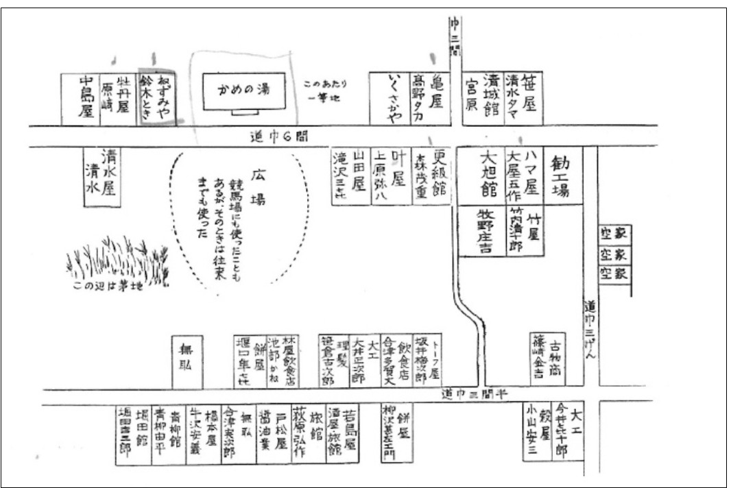 1893年(明治26)には何もない千曲川原に開湯し1959年にはこれだけの町ができあがっていたのである。1970年代には130万人程あった入湯客数が、昨年度は50万人弱ほどに減少して旅館数は30へ、店舗数も激減した。
