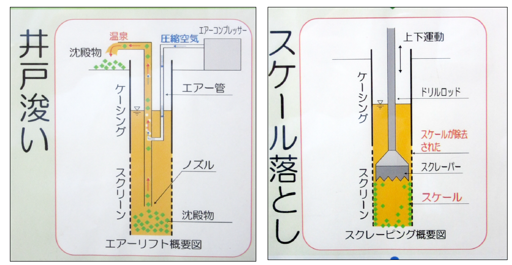 これでポンプが故障しない限り温泉は永久に出てくる理屈になりますが、ポンプは摩耗や砂を噛んで故障します。またケーシングパイプの途中に穴が空き冷たい水が混入します。これにより湯温が低下します。この場合スクレーパーという器具を使いパイプの内側に付着したスケールを削り取り、内径の小さいパイプを最初のパイプの内側に挿入します。