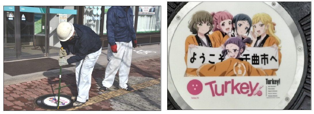 千曲市ではTVアニメ「Turkey!」のキャラクターをデザインした下水道マンホール蓋の設置を決定した。デザインは2種類で第1弾として1月13日に屋代駅前通りの八十二長野銀行屋代支店前と屋代駅前ロータリー前(北側歩道)で取り付けを行った。作業当日はアニメファンも現地を訪れ、設置したてのマンホール蓋を撮影していた。