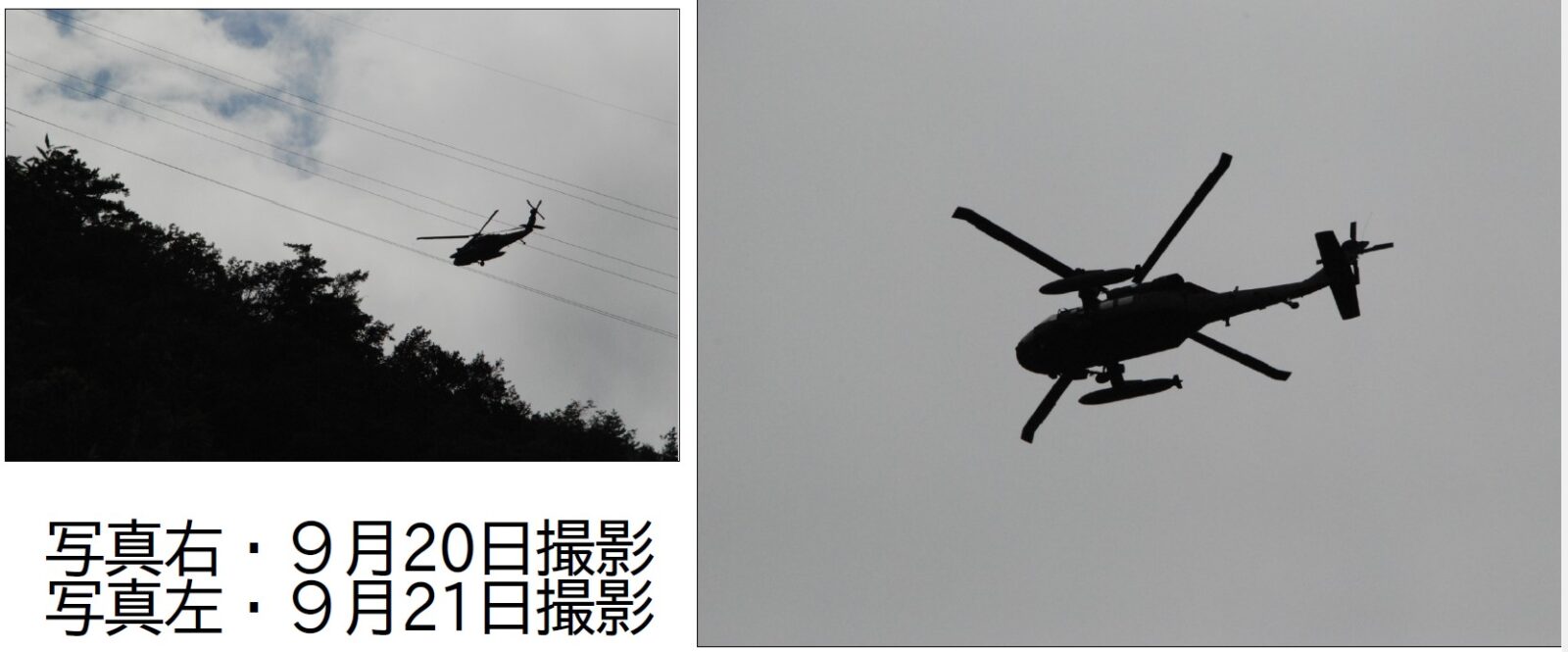 ▼今年9月以降千曲市上空での軍用ヘリコプターの飛行が相次いでいる。掲載写真はいずれも屋代で撮影したもので、有明山上空を南北に往復するケースが多いようだ。問題は飛行高度で左側写真の下に写っているのは森将軍塚古墳だが、その低空飛行ぶりが見て取れる。