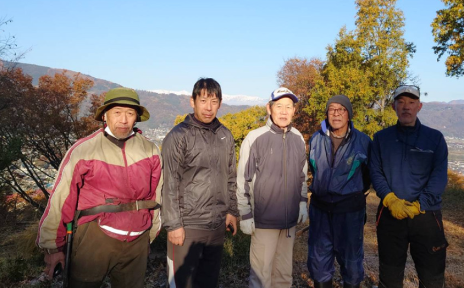 一重山みらい会議では11月16日に今年度の最終作業を実施。1~3の曲輪で草刈りと伐採した木の製材を行った。今年一番の寒さとなったが、雪化粧した北アルプスが望める好天での作業となった