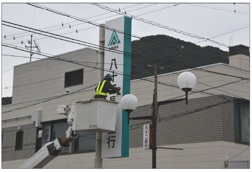 戸倉支店看板付け替え作業の様子(2025年10月)