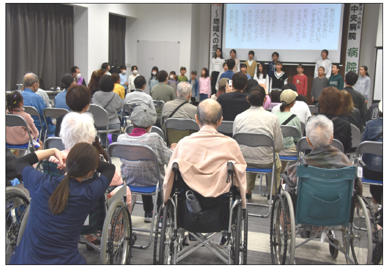 社会医療法人大西会・千曲中央病院は11月2日、院内を開放して病院祭を開催した。オープニングでは屋外ステージでチアダンスが登場し、警察犬のパフォーマンスや消防署、自衛隊の展示コーナーも設けられた。グルメコーナーではキッチンカーのほか屋代高校の生徒があんずのパウンドケーキなどを販売した。また、同校書道班の作品も院内に掲示された。屋代小学校6年生はステージ発表で合唱と宮澤賢治の「雨ニモマケズ」の詩を朗読した【写真】。そのほか骨密度やAIのワンコイン検診に、ゲーム形式の腹腔鏡の操作や調剤薬局の体験コーナーも設けられ、親子連れなどが挑戦していた。