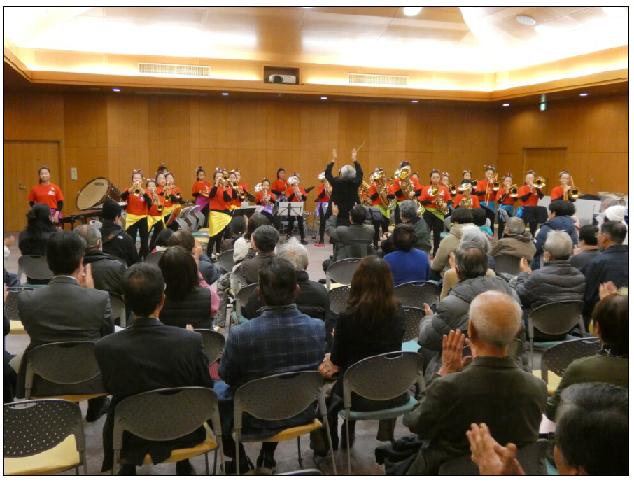 講演後、坂本さんを歓迎しようと町内の3つの小学校から集まる「さかきハッピーブラス」の29人による金管バンドが、上手く楽しい演奏とダンスを披露し会場は大いに盛り上がった。
