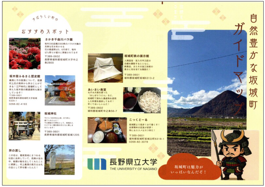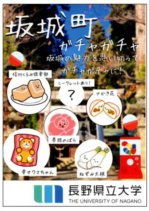 今回学生が完成させたのは「坂城町の案内動画」「イラストマップ」「特産品グッズ」の3点。動画では学生たちが着物姿で町の各スポットを歩き見どころを紹介。若者に人気のVlog風に制作した。イラストマップは施設や食事どころのほか、名所や史跡なども紹介し、村上義清のイラストキャラも添えた。町の特産品や和洋菓子店の商品をモチーフにしたキーホルダーや、村上義清の家紋などをデザインしたスマホグッズはカプセルトイの形で約50個ほど坂城町に贈られた。学生たちの若者ならではのアイデアには山村町長からも「大変感銘を受けた」との感想が聞かれた。