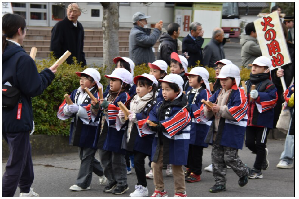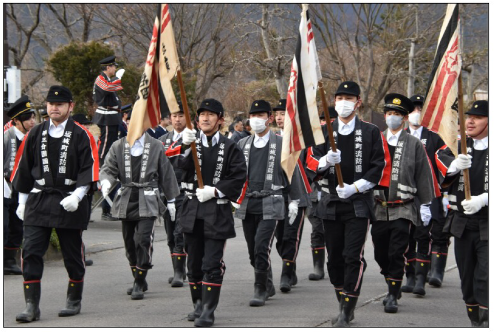1月18日、令和7年度坂城町消防団出初式が執り行われた。午前9時20分に花火の打ち上げを合図に街頭行進がスタート。坂城町消防団第1分団詰所付近から逆木通りを消防団員や消防団車両が行進。ラッパ分団が演奏するなか、千曲坂城消防本部のはしご車などの消防車両や幼年消防クラブの子どもたちも続き山村町長が観閲を行った。