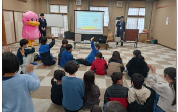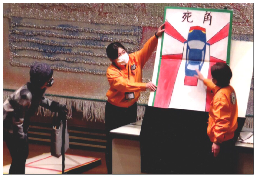 この後、県交通安全教育支援センターの職員による寸劇を交えた交通安全教室が開かれた。クルマからは歩行者や自転車、バイクの存在に気付きにくい死角が多く、特に交差点では危険が潜んでいることなどを写真や図を使って説明したほか、薄暮・夜間の外出では相手にわかるよう明るい色の服や反射材の着用を呼びかけた。
