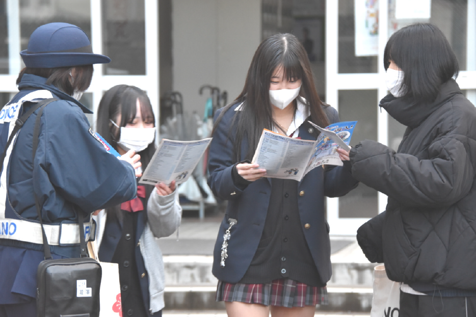 また、15日には年末交通安全運動の一環として、今年度の信州グッドチャリダーモデル校となっている屋代南高校の正門付近で、自転車乗車時のヘルメット着用と自転車の安全利用を呼びかけた。来年度から自転車の違反にも青切符が導入されることについてもチラシを手渡して説明した。【関連記事13面】