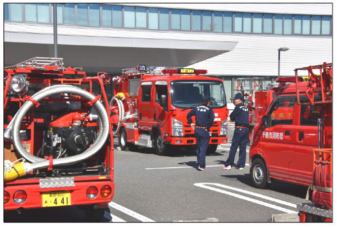 千曲市の消防団による「千曲市消防団フェスタ」が市役所南側駐車場で初めて開催された。会場には市内各分団の消防車両52台が展示、千曲坂城消防本部のはしご車や救急車のほか地震体験車(震源くん)も登場した。子ども向けに車両への乗車体験も行われ、子どもたちは消防車からのアナウンスなどにも挑戦した。駐車場では消防用ホースの展張体験や放水体験にも多くの親子連れが参加していた。
