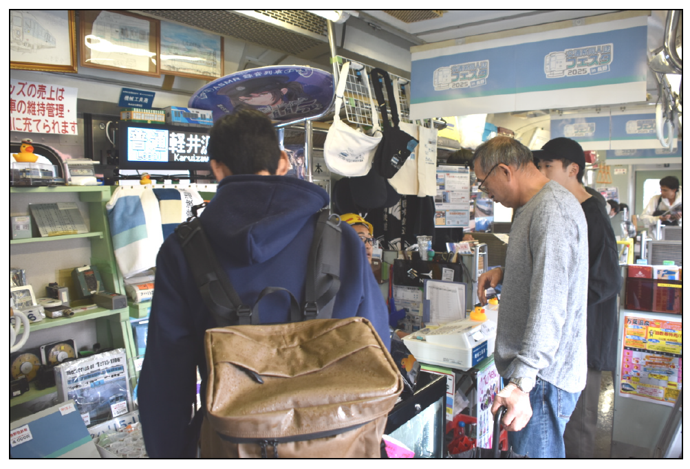 戸倉の万葉超音波温泉で同日に開催された第4回鉄道フェスタin万葉超音波温泉でも115系電車の車内を開放、出区点検実演や運転席の有料操作体験を実施した【写真左】。交通系同人誌フェスタ2025の展示販売も行われ、県内をはじめ関東や関西から昨年を上回る12のサークルが参加した。坂城駅と万葉温泉の間を循環する国鉄仕様のレトロバスも運行され、両方のイベントをはしごする参加者も多かった。