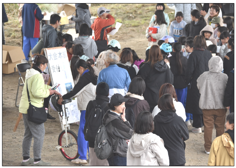 11月9日の第19回千曲川一輪車チャレンジレースも、雨は上がったものの路面が滑り転倒の恐れがあるため中止に。参加予定だった子どもたちには千曲橋の下で抽選を行い入賞者用の商品をプレゼントした。大会記念のキーホルダーもじゃんけん大会で希望者に贈呈された【写真】。