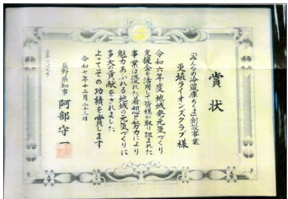 生活困窮者のため個人や企業から寄付された食料品などを保管して定期的に提供する取り組み「みんなの冷蔵庫」の活動を行っている更埴ライオンズクラブが、県長野地域振興局から表彰を受けた。