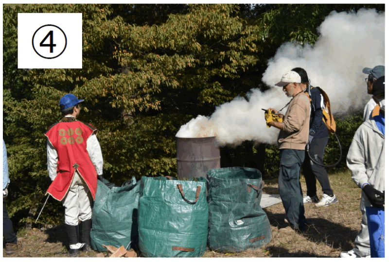 当日、森将軍塚古墳館がクラフト展を開催していた科野の里歴史公園でも屋代城の狼煙を確認して、ボランティア参加の千曲坂城クラブ・HSCの中学生たちが「信濃の国」を斉唱した。屋代城でもHSCのメンバーが前日からスギの枝集めに協力、当日も運搬などの作業で積極的に活動していた。