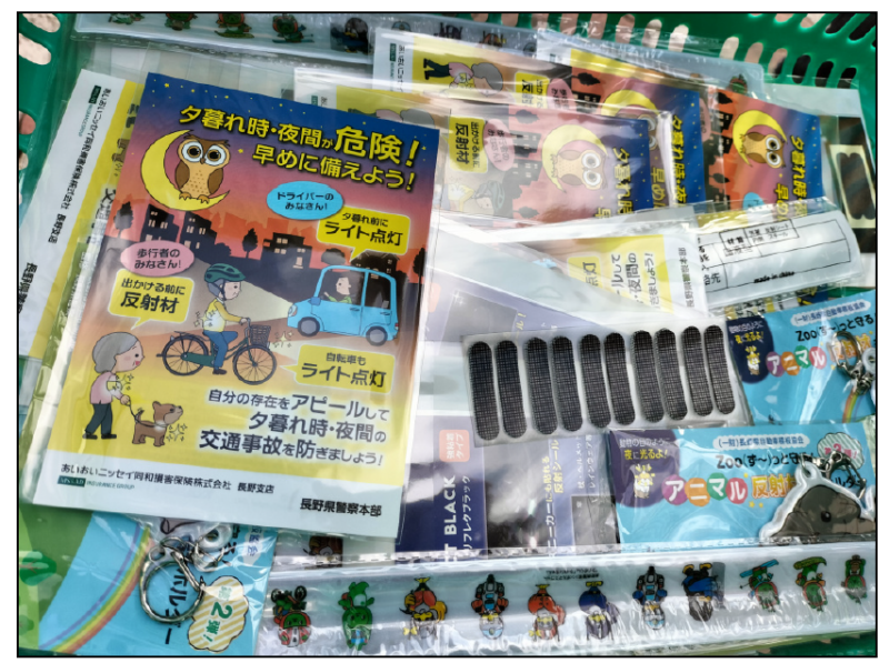 - 夜光反射材 「ピカピカペッタンコ作戦」夜光反射材 「ピカピカペッタンコ作戦」 夜光反射材を着用することで交通事故防止効果を高めようと、千曲警察署は